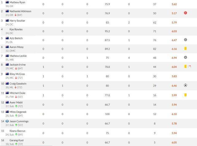 在比赛中送出1次助攻的登贝莱,本场赛后获得了8.11分的评分,另外一位送出助攻的球员特奥获得了7.94分。澳大利亚队方面进球球员古德温获得6.46分评分。