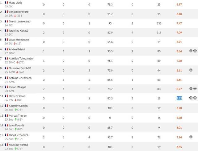 全场最高分给到了法国队的拉比奥,本场拉比奥在90分钟时间内送出了1粒进球和1次助攻,此外还有全场最高的5次抢断。在赛后拉比奥获评8.64分的全场最高分。