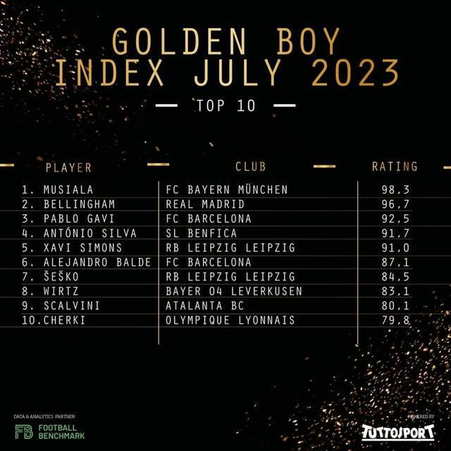 金童奖最新排名:穆西亚拉98.3分居首,贝林厄姆96.7分位居次席