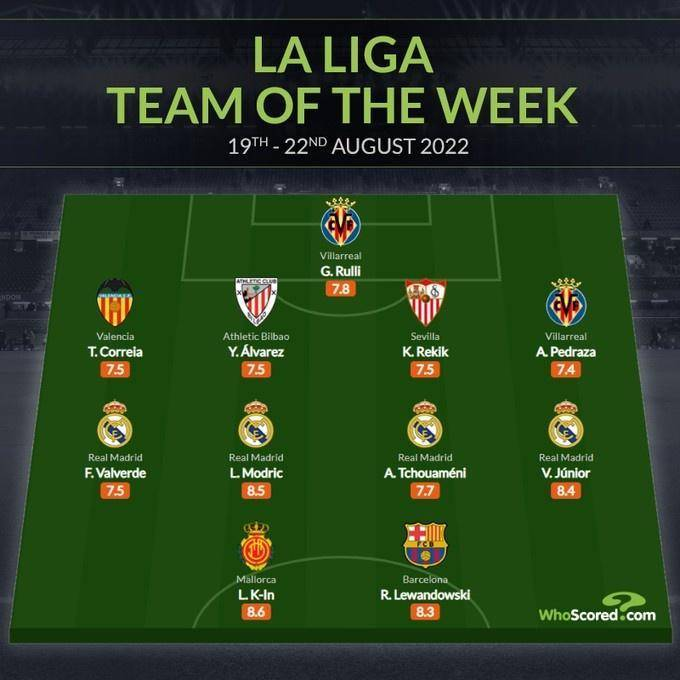 whoscored西甲第2轮最佳阵:魔笛领衔皇马4将,莱万李康仁在列